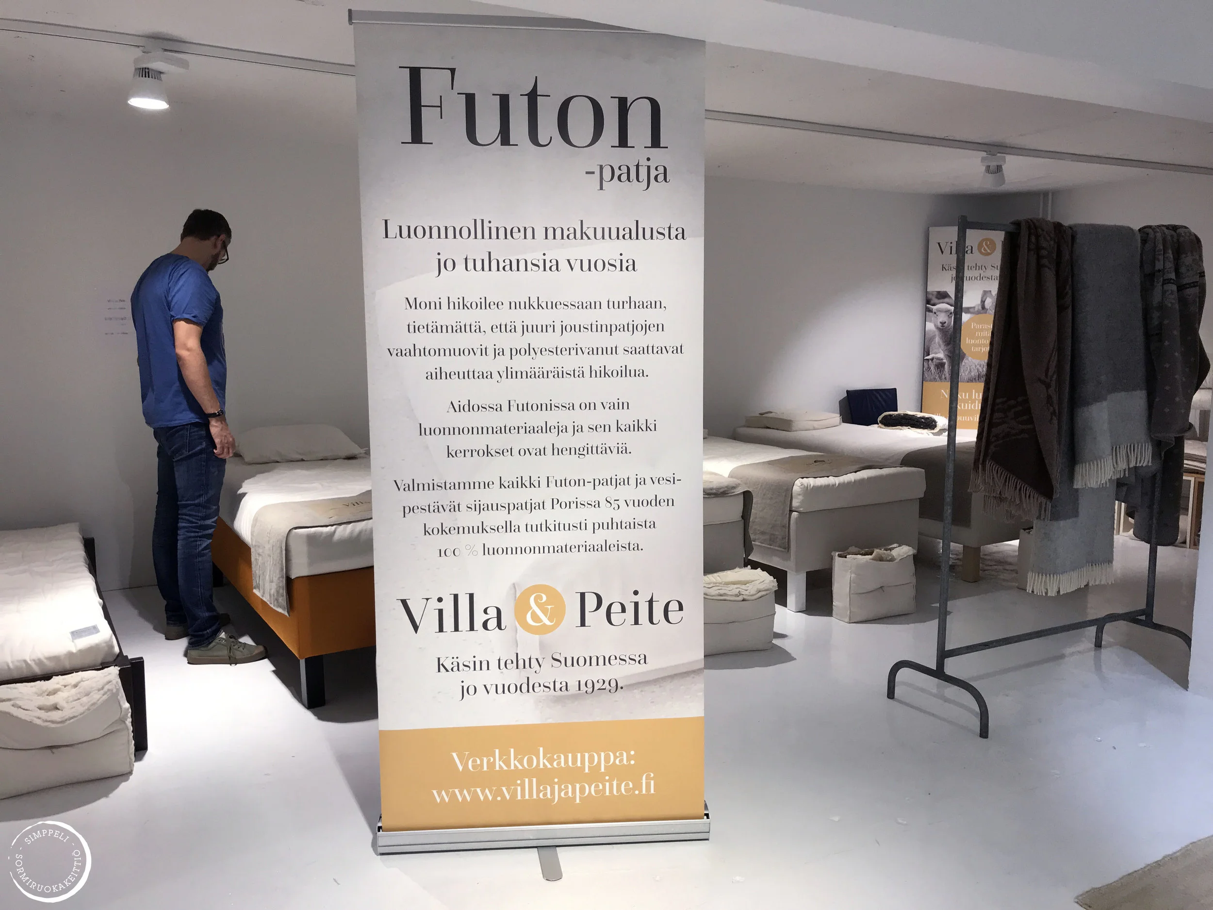 Osa patjoista oli toki liiankin joustamattomia omaan makuuni: tuntui kuin olisi suunnilleen ruokapöydän päälle käynyt pitkäkseen. Mutta joukossa oli myös erityisesti ensimmäiseksi futoniksi suositeltu villaa ja luonnonkumia (ei siis öljypohjainen, huom!) sisältävä joustopatja, jota Villan ja Peitteen Antti meille suosittelikin. Ja siihen päädyimme.