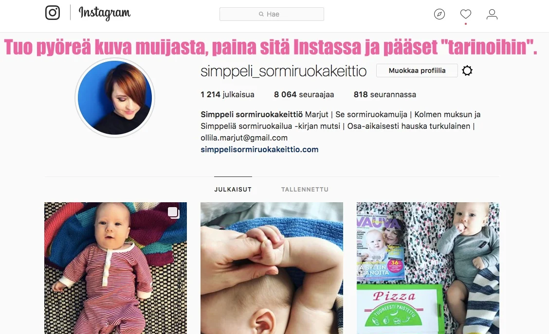 Olen nuuskinut messuohjelman ja valinnut sieltä teille etukäteen aiheita, joiden uskon kiinnostavan. Vinkkeihin ja tärppeihin pääsee käsiksi etukäteen ja varsinkin messuviikonloppuna Simppelin sormiruokakeittiön Instagram-tilillä, ja tarkemmin InstaStoryssa. Jos tuo storyominaisuus on vielä tuntematon, näin löydät sen: