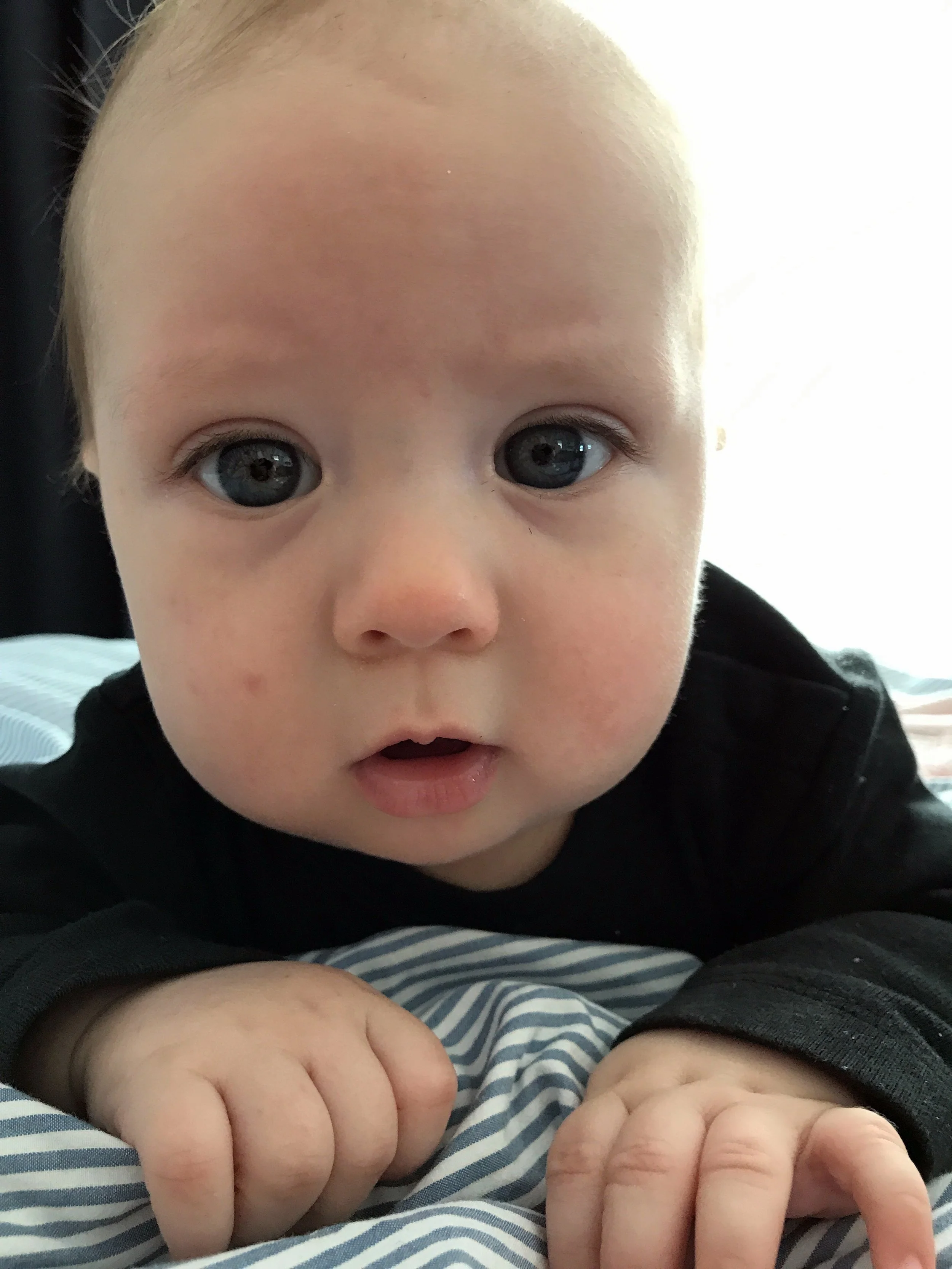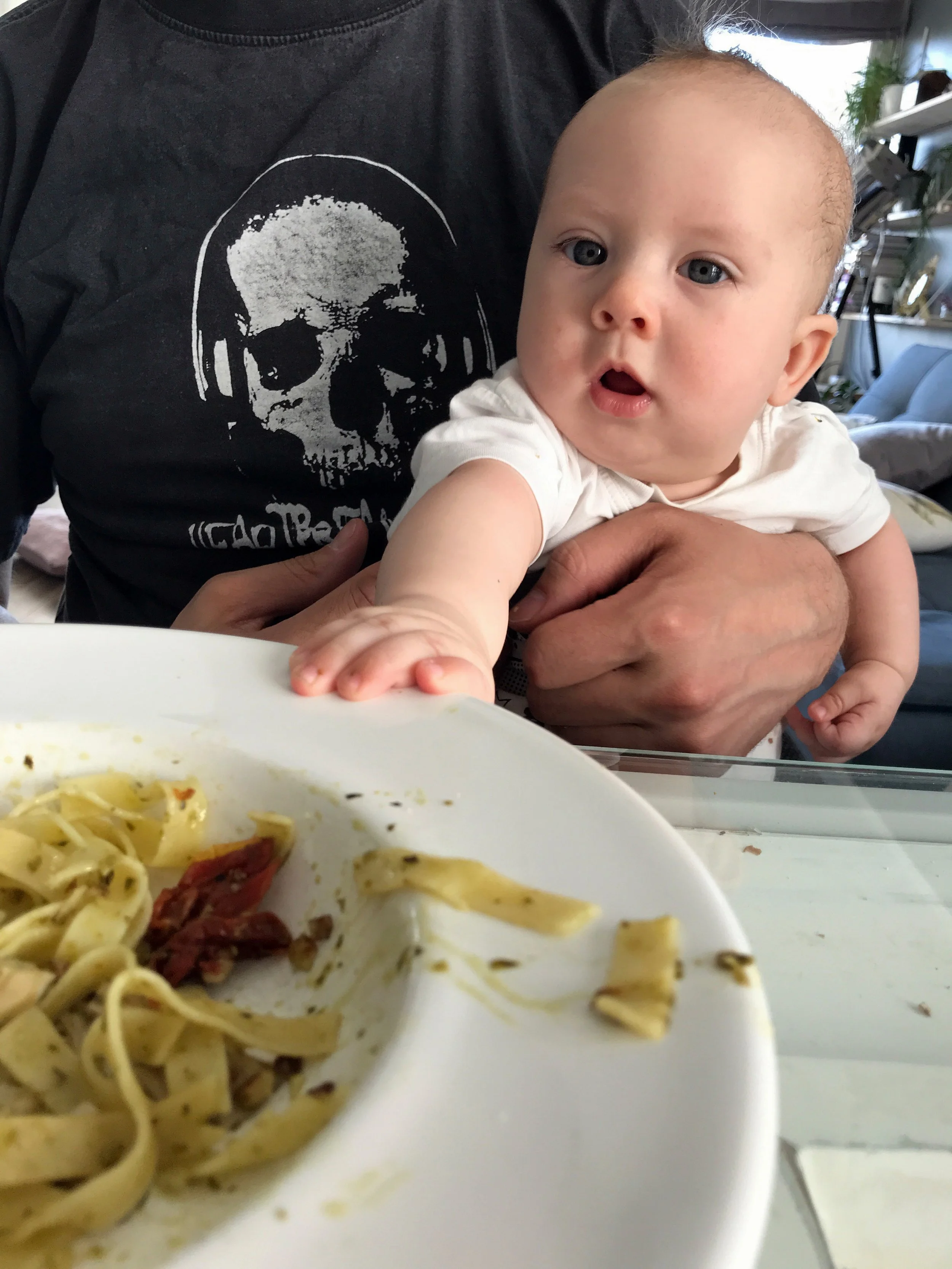 Filip täytti kaksi päivää sitten, äitienpäivänä, neljä kuukautta. Iän puolesta hän olisi valmis jo maistelemaan kiinteää ruokaa. Miksei vaikka ihan omatoimisestikin, sormiruokaillen!