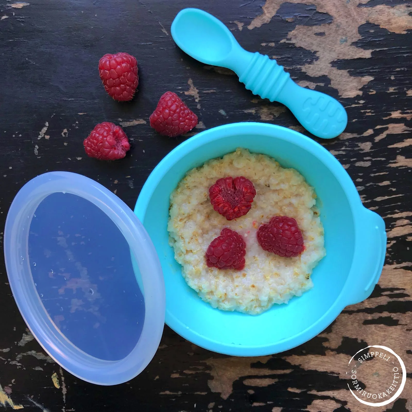 Oma pikkukulho ja imukuppi pohjassa! Tässä voi kuljettaa hiutaleet kuivina mukana ja lisätä sitten veden. Mikroon, ja puuro on parissa minuutissa pöydässä!