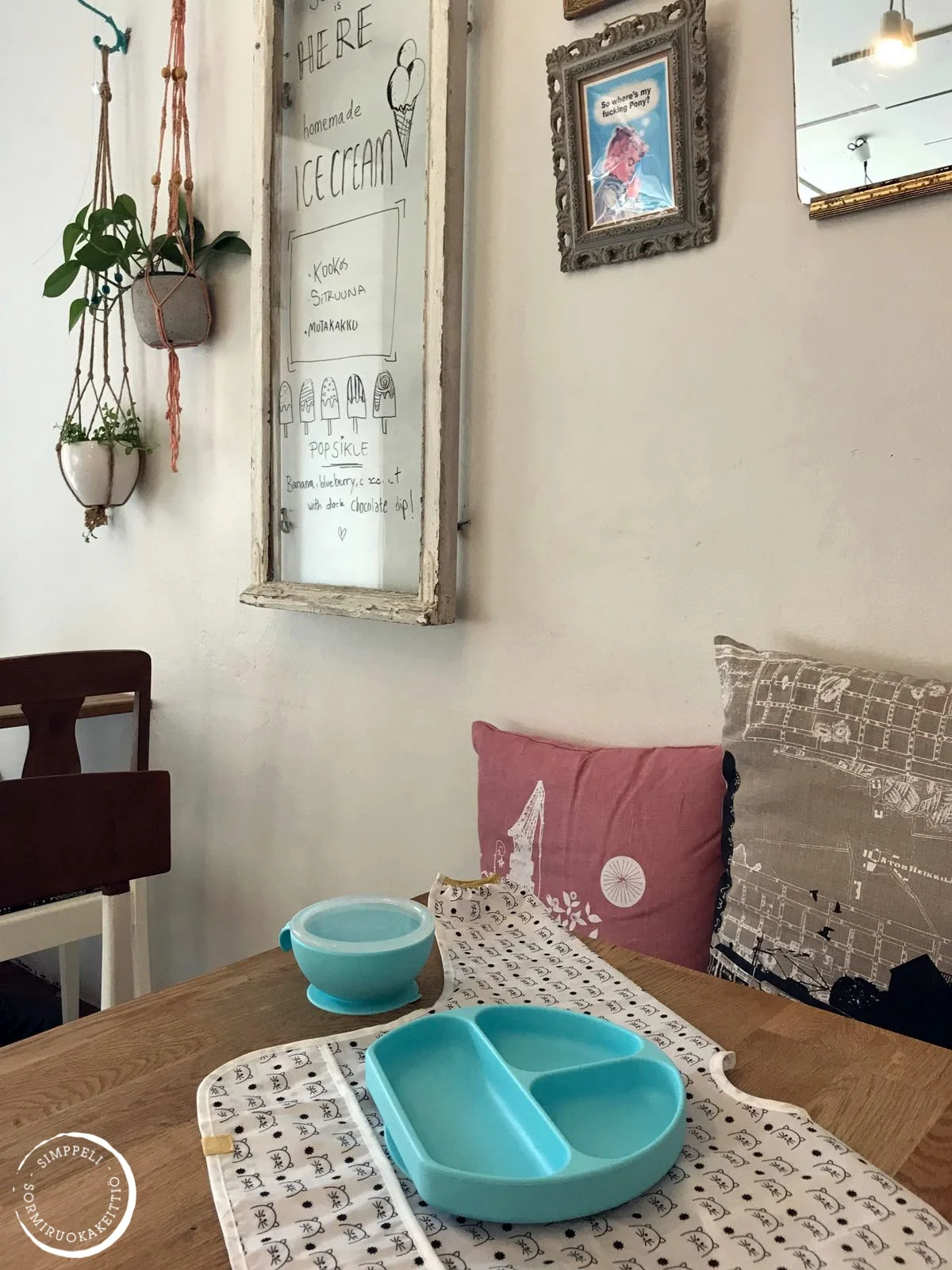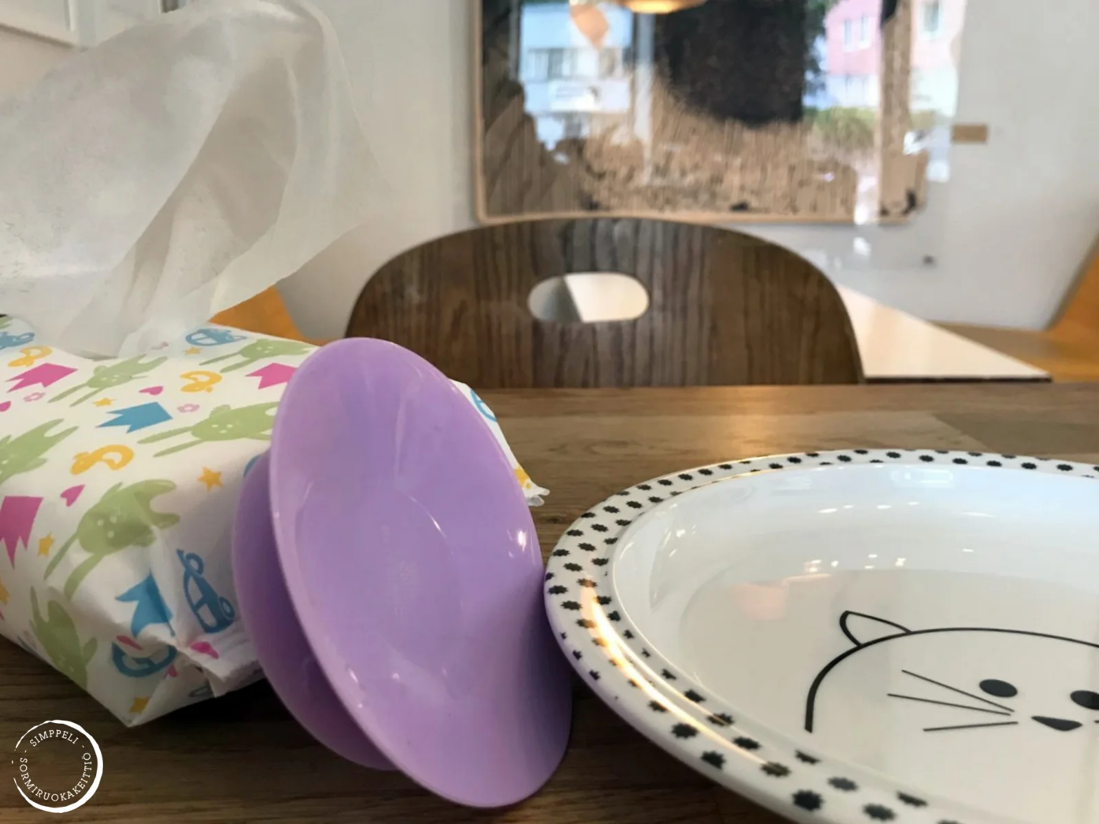 Ravintolasta saat kyllä lapselle lautasen, eikä sen putoaminen lattialle ole katastrofi. Ei ole silti väärin tuoda apuvälineitä mukanaan.