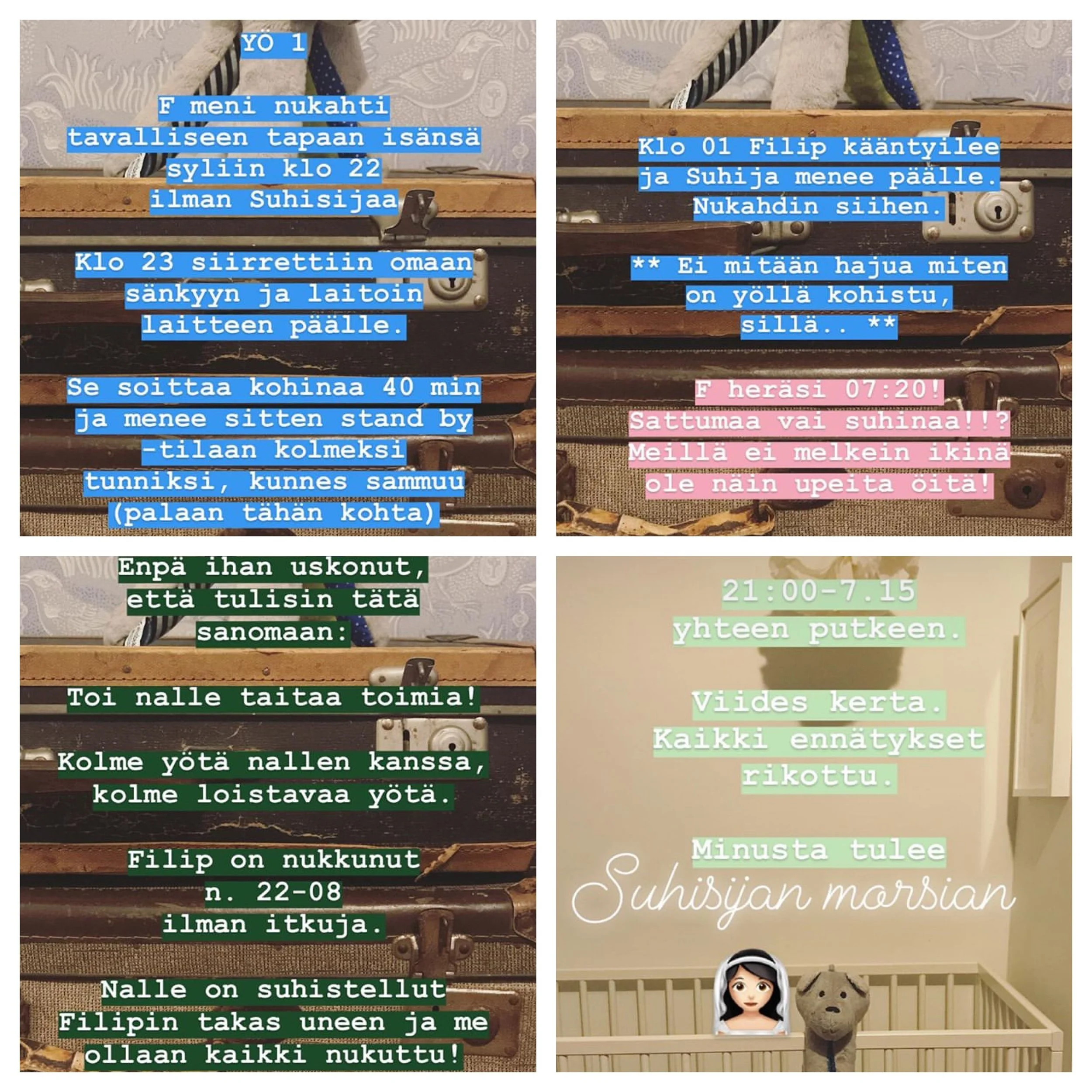 Tämän kolmisen kuukautta kestäneen testikauden aikana lapsukaisemme on varttunut vauvasta pikkutaaperoksi. Edelleen napsautamme joka ilta Suhisijan päälle, hiukan kuin ottamaan koppia. Ja edelleen se toimii. Ja tässä välissä olemme myös kokeilleet olla ilman Suhisijaa, tieteen nimissä. Ja reisillehän ne yöt menivät. Olen testannut myös soittaa vaaleanpunaista kohinaa YouTubesta, mutta se ei toiminut jostain syystä yhtä hyvin. En tiedä oliko syy sitten kohinassa (oliko se edes pinkkiä) vai siinä, että kohina oli yhtäjaksoista. Mutta en minä kiellä kokeilemasta YouTubea tai vastaavaa.