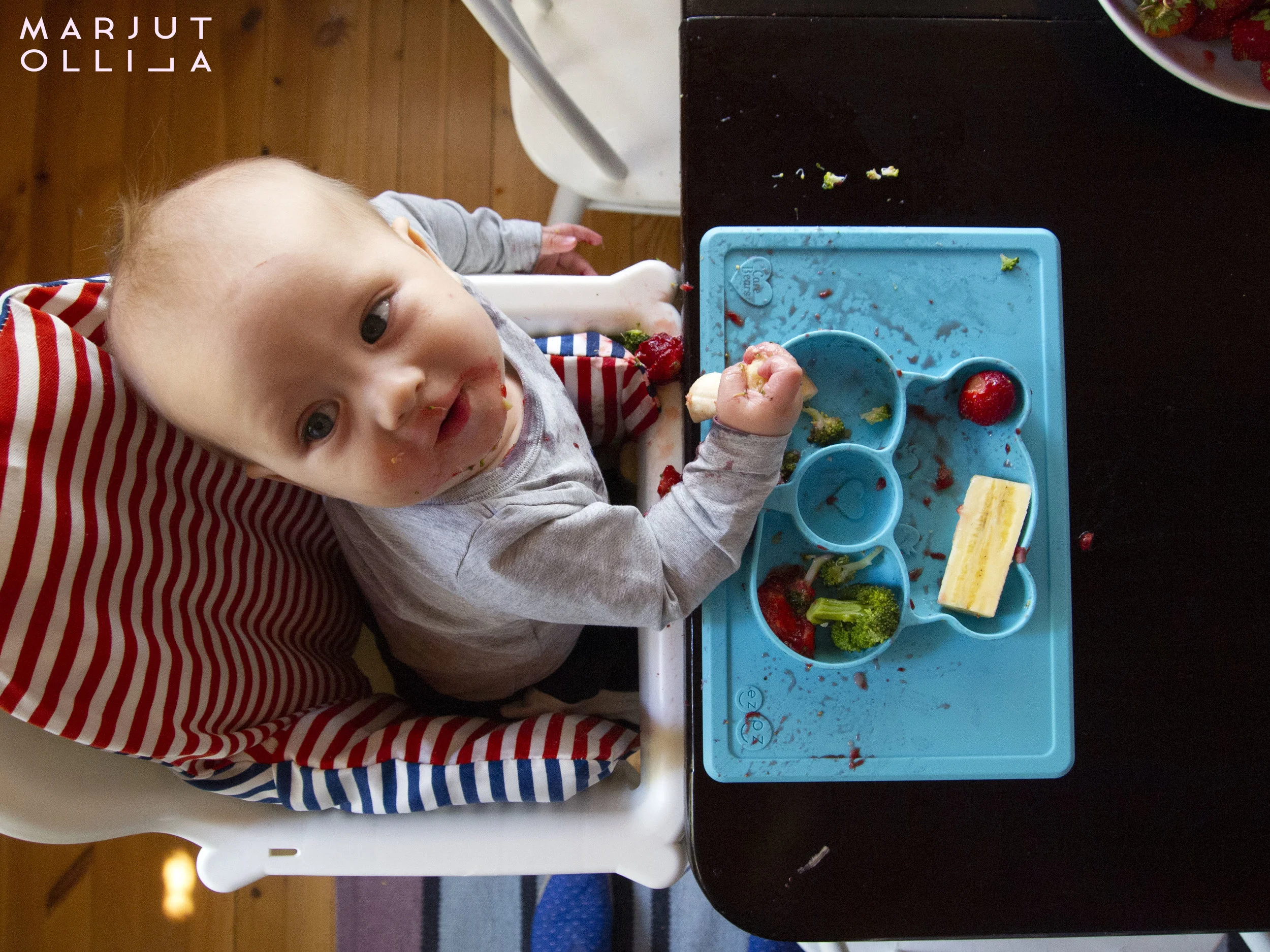 Käytännössä tämä tarkoittaa siis sitä, että edetään nk. rohkaisulistan mukaan ja vauvan ruokavalioon otetaan reippaasti eri raaka-aineita eri ruoka-aineryhmistä aina kun se iän puolesta on mahdollista. Kasvikset, marjat, hedelmät, kala, kana, kananmuna ja liha (jos sekaruokaileva perhe), palkokasvit, viljat, maitotuotteet kaikki reippaasti vauvan lautaselle (pl. toki allergiat tai muut rajoitteet).
