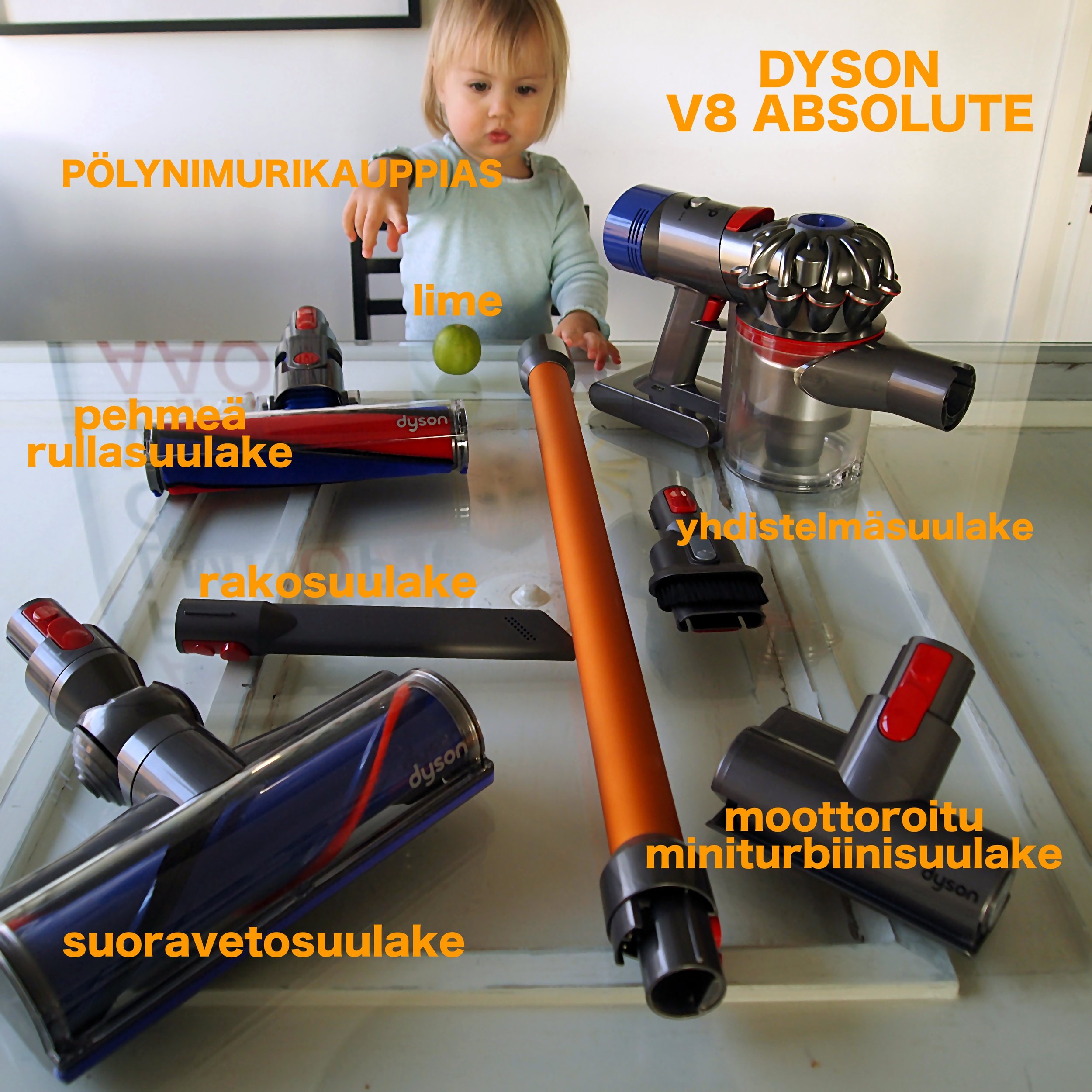 Samaan aikaan kuitenkin rakastan kaikenlaisia vempaimia aina keittiön pienkoneista höyrymoppeihin ja voimatyökaluihin. Riemullani ei tästä syystä ollut rajoja, kun Dysonin maahantuoja Suomen Sähkötuonti vastasi vienoon pyyntööni myöntävästi ja lähetti minulle sormiruokailuarkea silmällä pitäen testiin Dysonin uusimman varsi-imurin: V8 Absoluten.