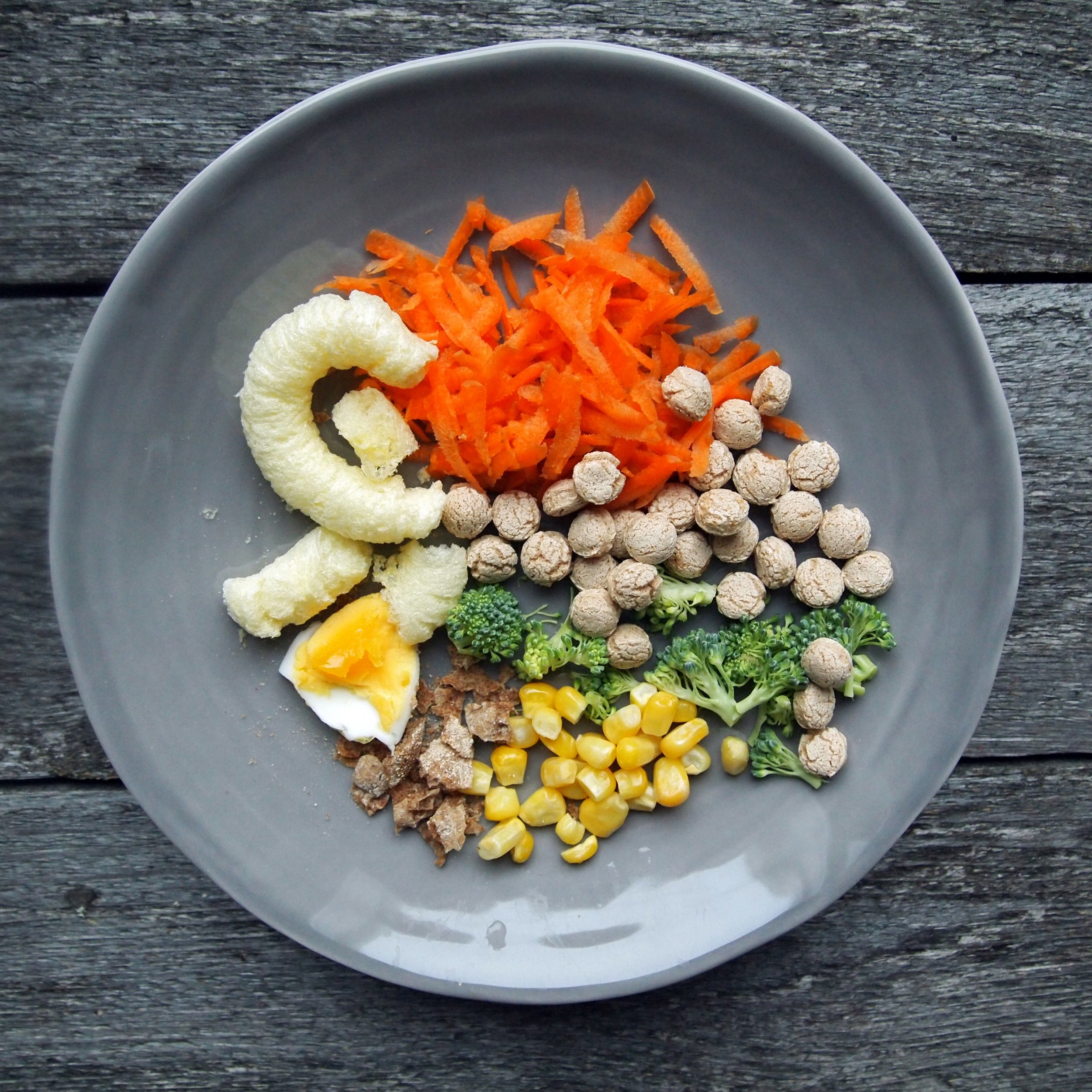 Porkkanaraastetta, talkmuruja, parsakaalia, maissia, näkkileipää, keitettyä kananmunaa ja maissinaksuja.