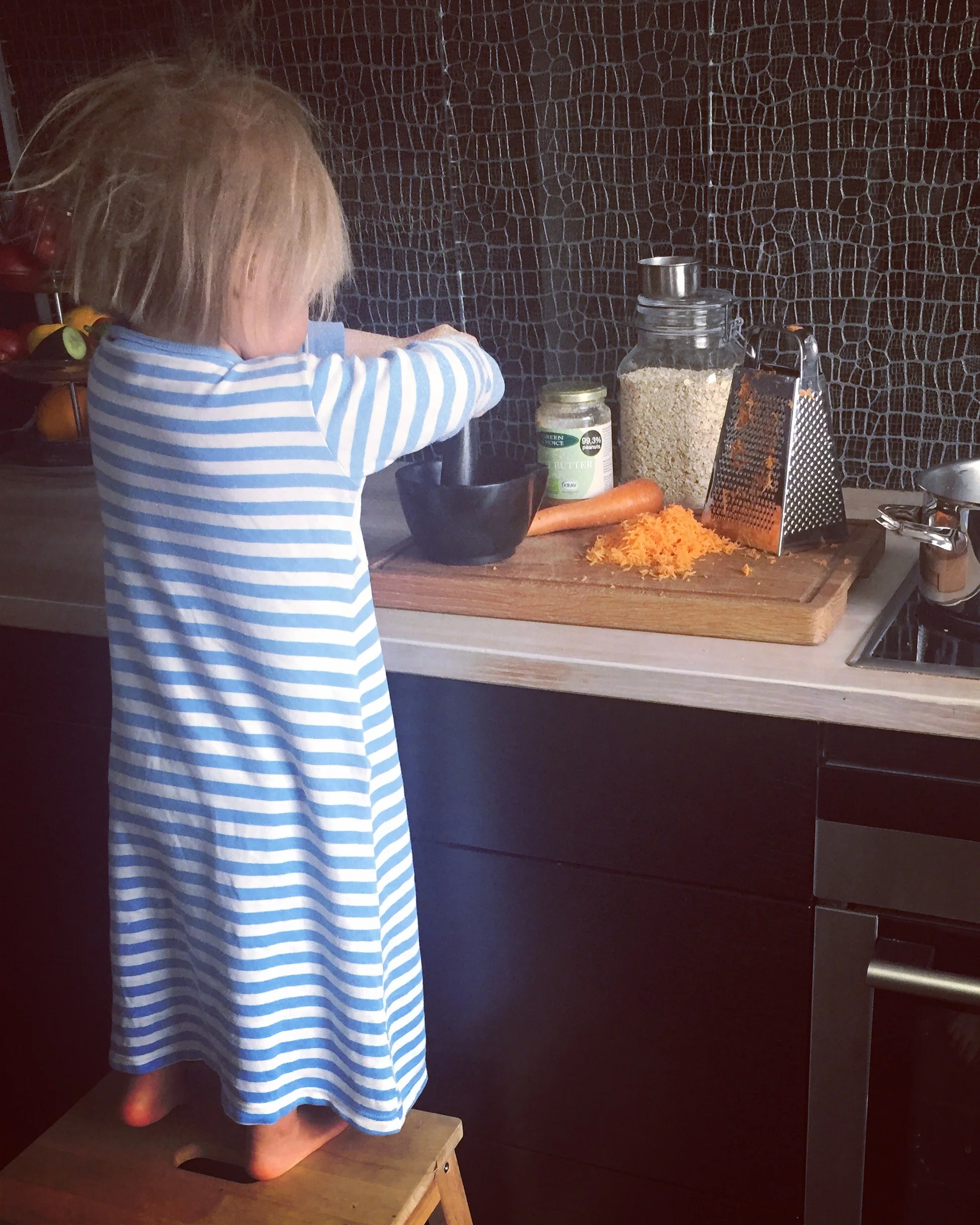 Sillä aikaa kun Iris murskasi minä raastoin porkkanan. Kyllä vain, tähän puuroon tulee porkkanaraastettakin! Parempi varmaan kirjoittaa koko resepti nyt vain tähän :)