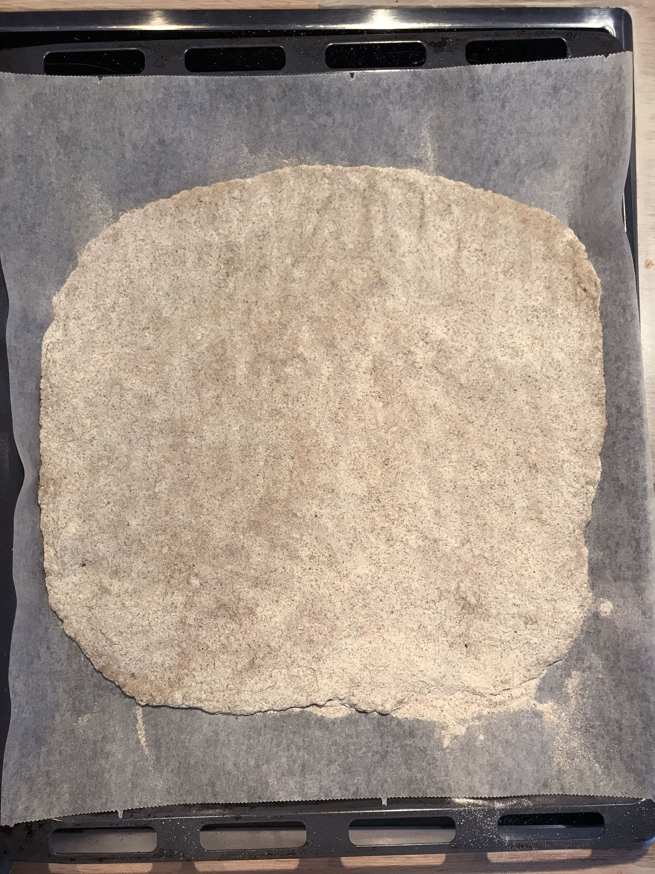 Taikina leivitetään pellille ja päälle ripotellaan jauhoja. Lopuksi se taputellaan litteäksi käsin.