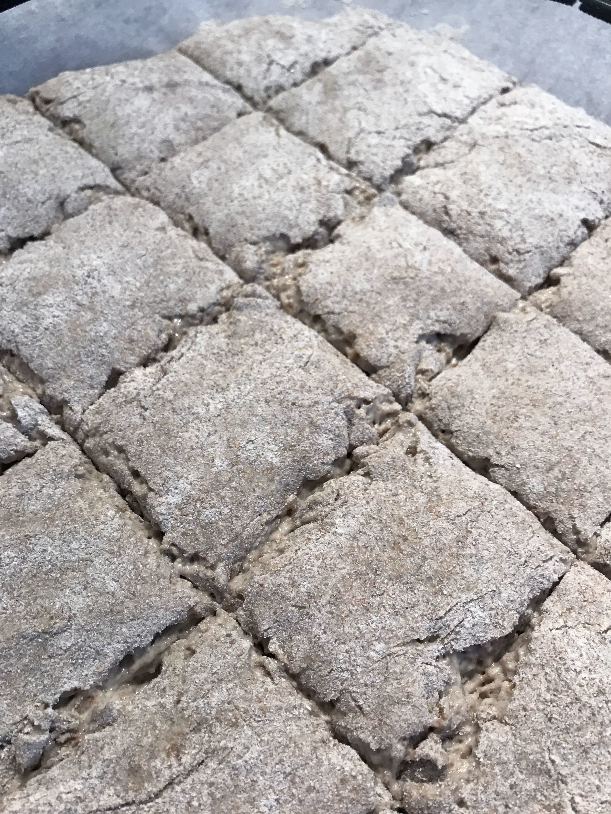 Toisen kohotuksen jälkeen, juuri ennen uuniin laittamista, leipään painellaan viiltoja.